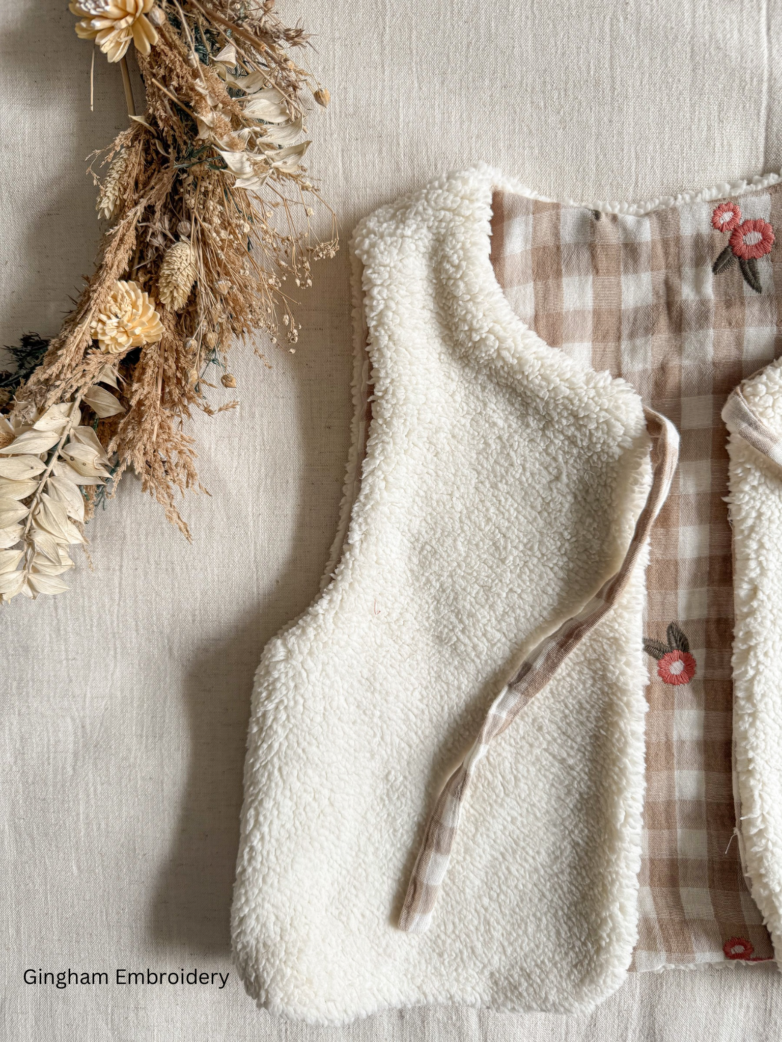 The sweetest handmade reversible cream teddy gilet in your choice of fabric. The super soft teddy fabric against the delicate cotton double gauze contrasts beautifully. Perfect paired with our blouses and dresses.